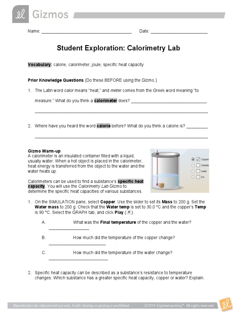 When a hot object is placed in the calorimeter, heat energy is transferred from the object to the water and the water heats up. Use the slider to set its mass to 200 g. Get free student exploration calorimetry lab answer key kindle buffet from weberbooks.com is updated each day with the best of the best free kindle books available from amazon. Select the graph tab, and click play ( ). Student exploration calorimetry lab gizmo answers 2.